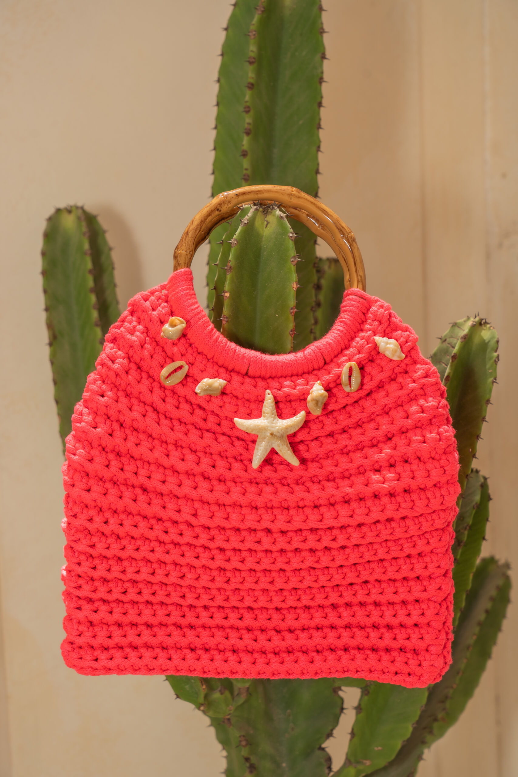 A masterpiece that blends the vibrancy of coral with the beauty of nature. Hand-knitted with premium yarn and adorned with a natural starfish and seashells, featuring elegant wooden handles.