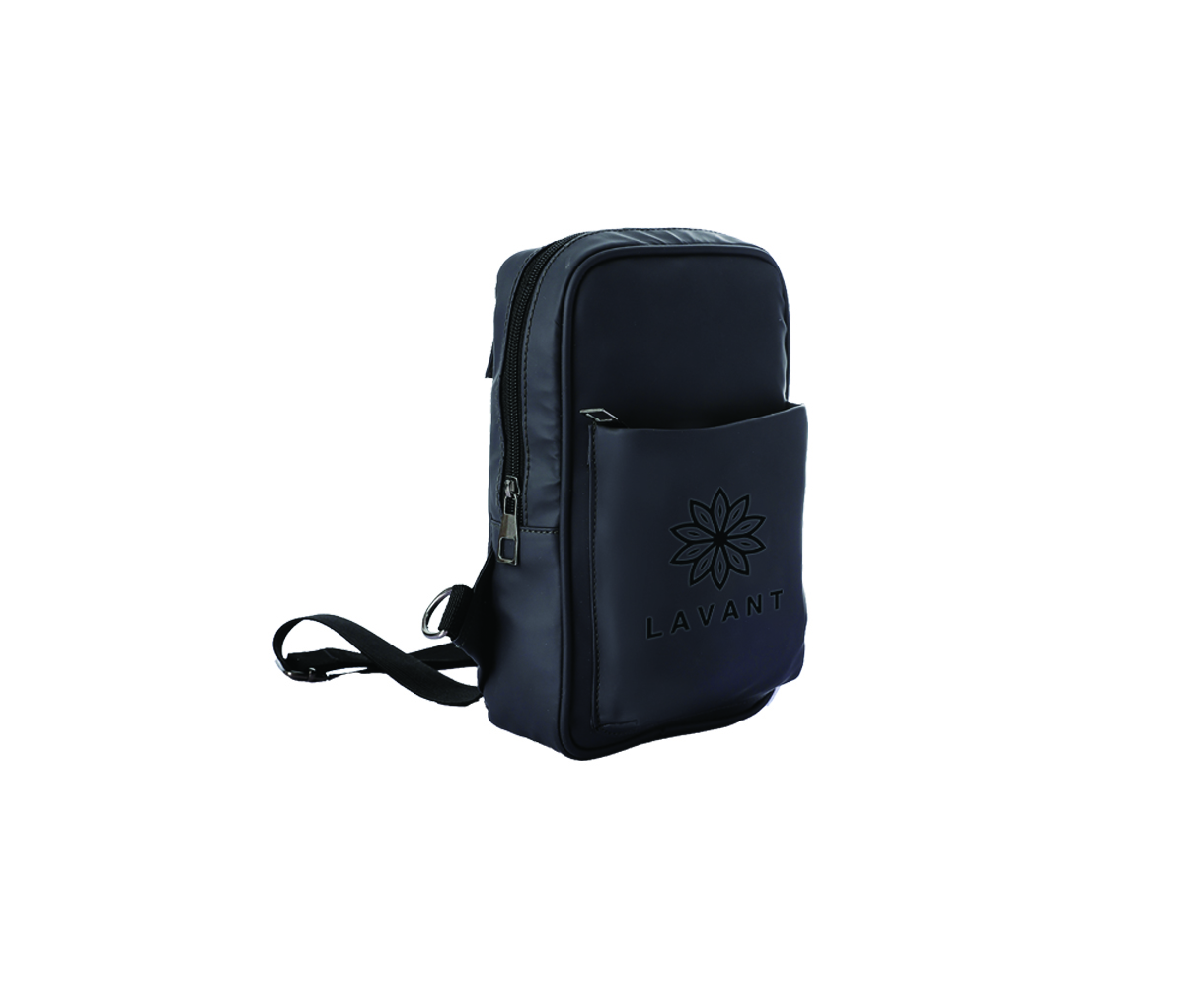 This is a black, compact shoulder bag or “sling bag,” featuring a sleek and practical design with the “LAVANT” logo embossed on the front pocket. It is ideal for carrying daily essentials lightly and easily, and is made from a leather or leather-like material.